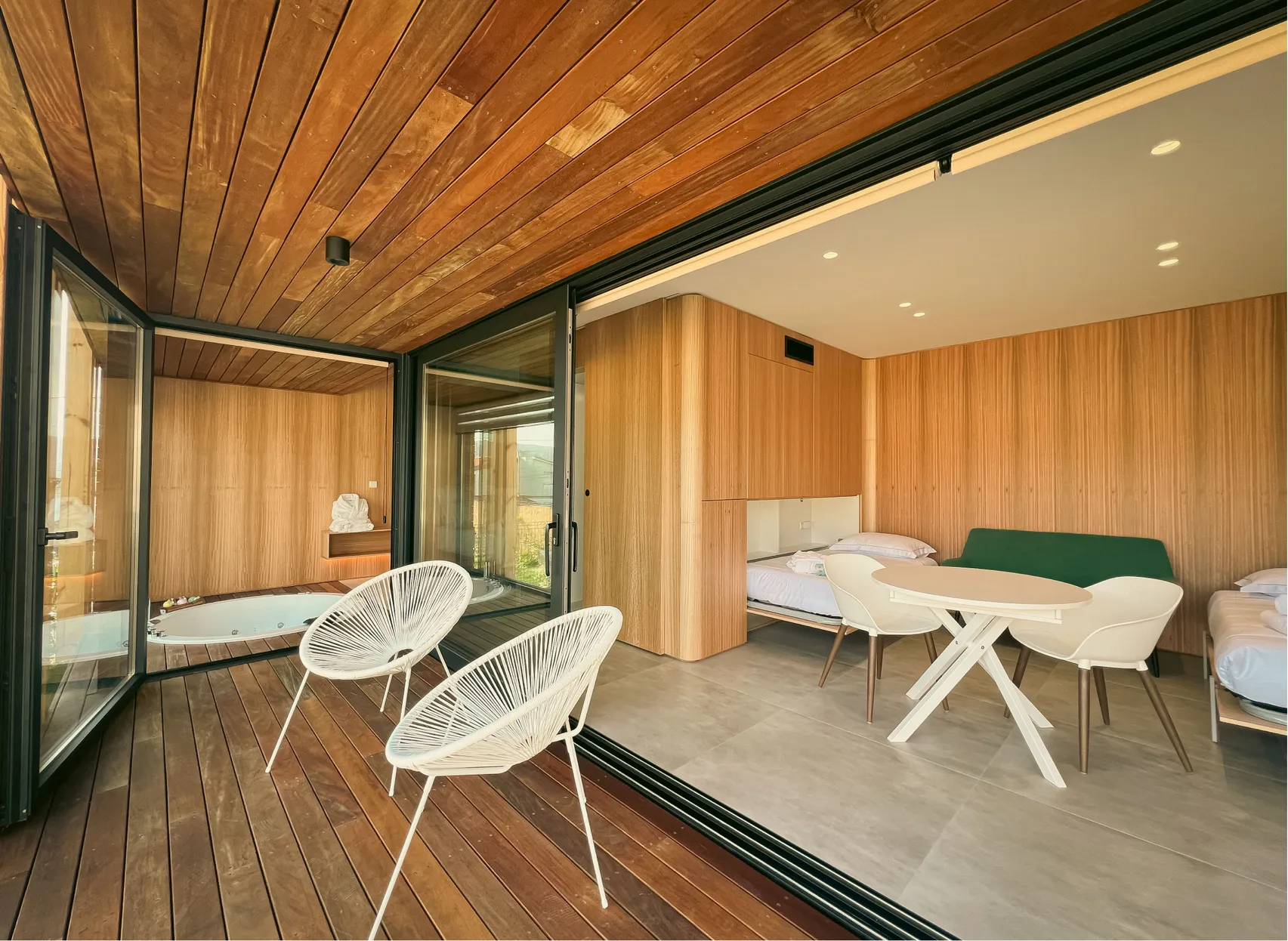 Cada villa está pensada para alojar hasta cuatro personas, lo que la convierte en una opción versátil tanto para parejas como para pequeñas familias. La arquitectura combina materiales naturales con equipamientos modernos, generando un equilibrio entre lo rústico y lo contemporáneo.