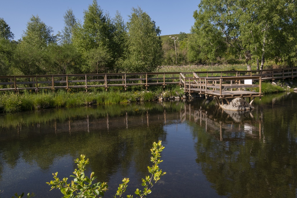 Estas pasarelas permiten recorrer la ribera, adentrarse en el bosque y disfrutar del agua cristalina desde muy cerca. El contraste entre la madera, la piedra, el agua y el verde de la montaña crea un ambiente muy evocador y reposado.